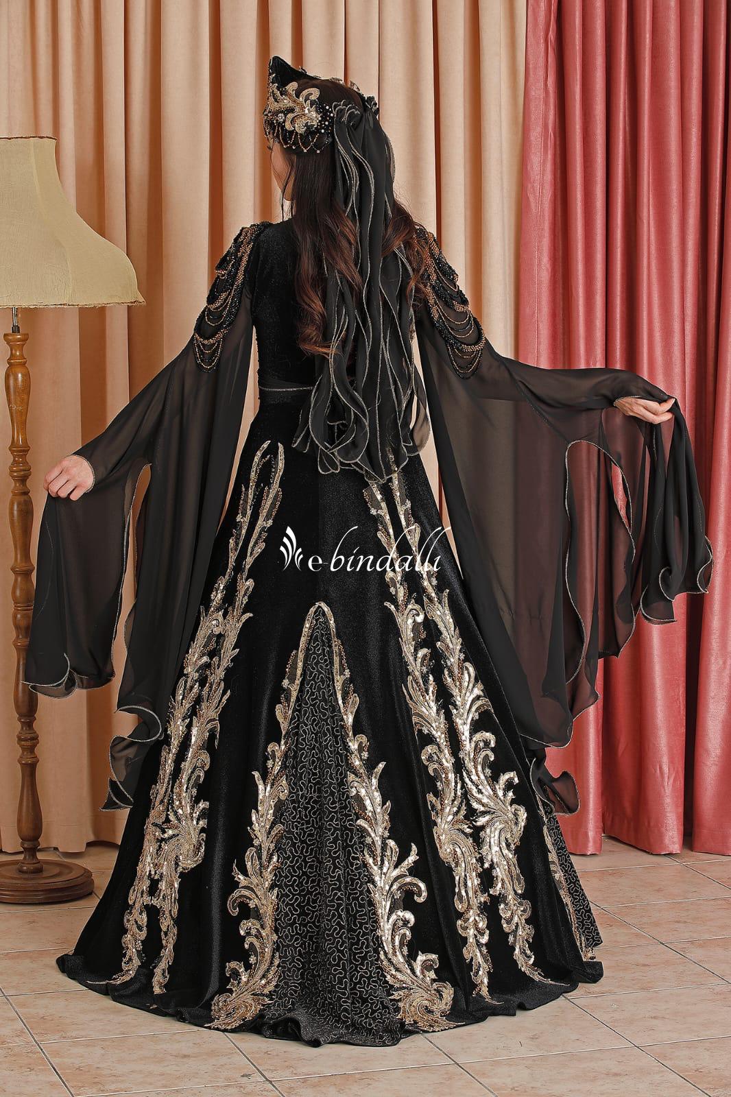 siyah kadife bindallı modeli, iç elbisesi şifondur, kolye kemer başlık tarlatan ve iç elbisesi dahildir
